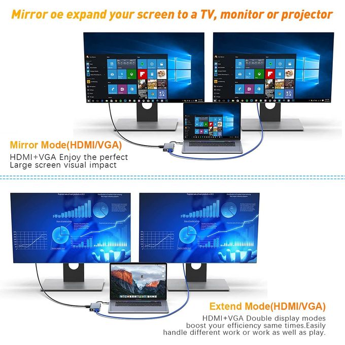 Dual Display 4K UHD Visual Feast & Card Reader USB C Docking Station with Two High Definition Video Outputs: HDMI + VGA. In Advanced Mode, MacBook Pro Dock offer your laptop 3 multiple displays, from HDMI output, a VGA output and a laptop screen. For mirror mode, our hub also supports three displays, but in this mode there are two screens that display the same interface.