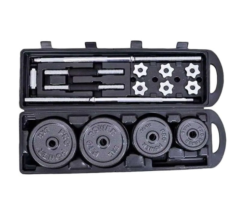 50kg dumbbell & barbell set, black plastic carrying box. This fantastic 50kg barbell dumbbell set has everything you need to become a tough bodybuilder. Combine weights to add extra intensity to your workout. Great for improving muscle strength, tone, and definition.