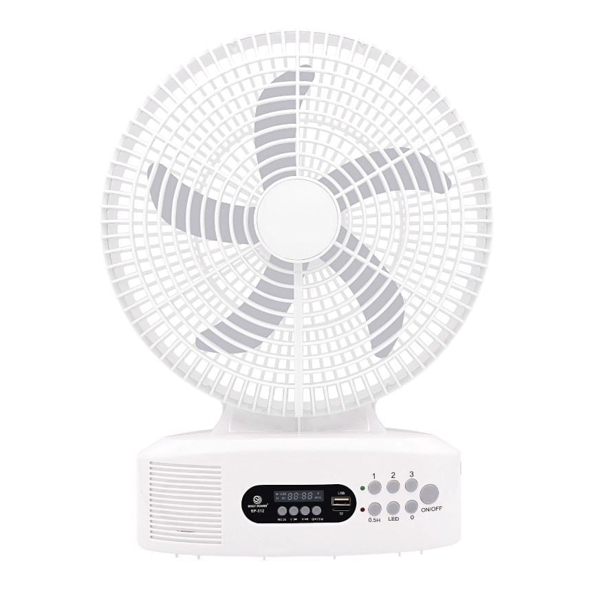 The ultimate combination! 3-speed Rechargeable 12 inch AC/DC Solar Powered Fan, with Radio, USB, Speakers, Bluetooth and LED light.