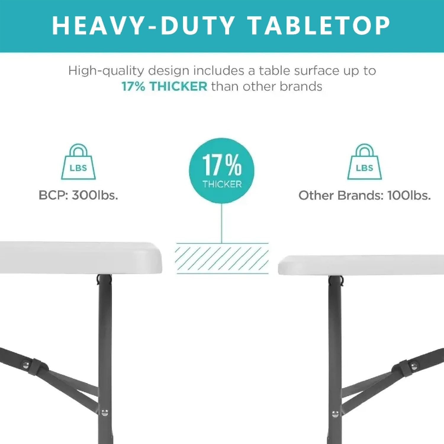 HIGH QUALITY HEAVY DUTY TABLE: HDPE Table top easy to clean, with a honeycomb design that disperses the pressure exerted on the table top, allowing it to hold up to 300lbs. Table Board Made of High-Density Plastic, It's Thickness Reach to 4cm, It's Use Durable Steel Frame Legs to Ensuring Long-Lasting Use, Steel Tube Diameter is 25mm, Which Much Bigger and Stronger than Others.