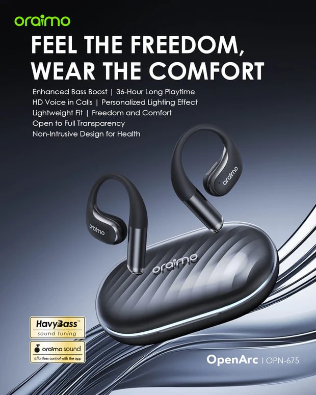 The Oraimo OpenArc OPN-675 Open-Ear Wireless Earphones bring you an all-new way to experience music, calls, and movement — all while staying completely aware of your surroundings. Designed with a lightweight arc-fit structure, these open-ear earbuds are perfect for fitness enthusiasts, outdoor adventurers, commuters, and anyone who prioritizes both sound quality and situational awareness.