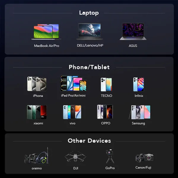 *Oraimo PowerJet 130 Power Bank is compatible with more than 1,000 major devices, including Apple, SAMSUNG, Tecno, Infinix and Mi smartphones and Type-C port charging Laptops such as MacBook Pro 13"/ MacBookPro 14" / MacBook Pro 15"/MacBook Pro 16"/MacBook Air Series; HP Spectre/ Zbook; Google Pixelbook; Dell/Google Pixelbook/Microsoft Suface Book/ThinkPad and more.